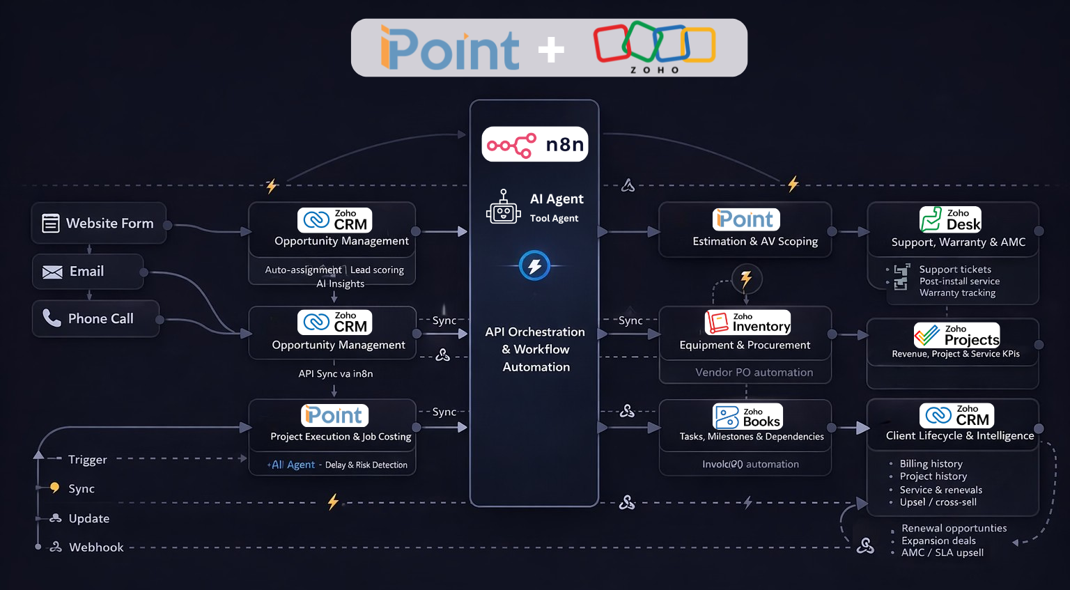 This architecture illustrates how sales, execution, finance, and service operate as one continuous system. Leads flow into Zoho CRM, projects are executed through iPoint, financials are synchronized via Zoho and QuickBooks, and service feeds lifecycle intelligence back into CRM—fully orchestrated through n8n and AI-driven automation.