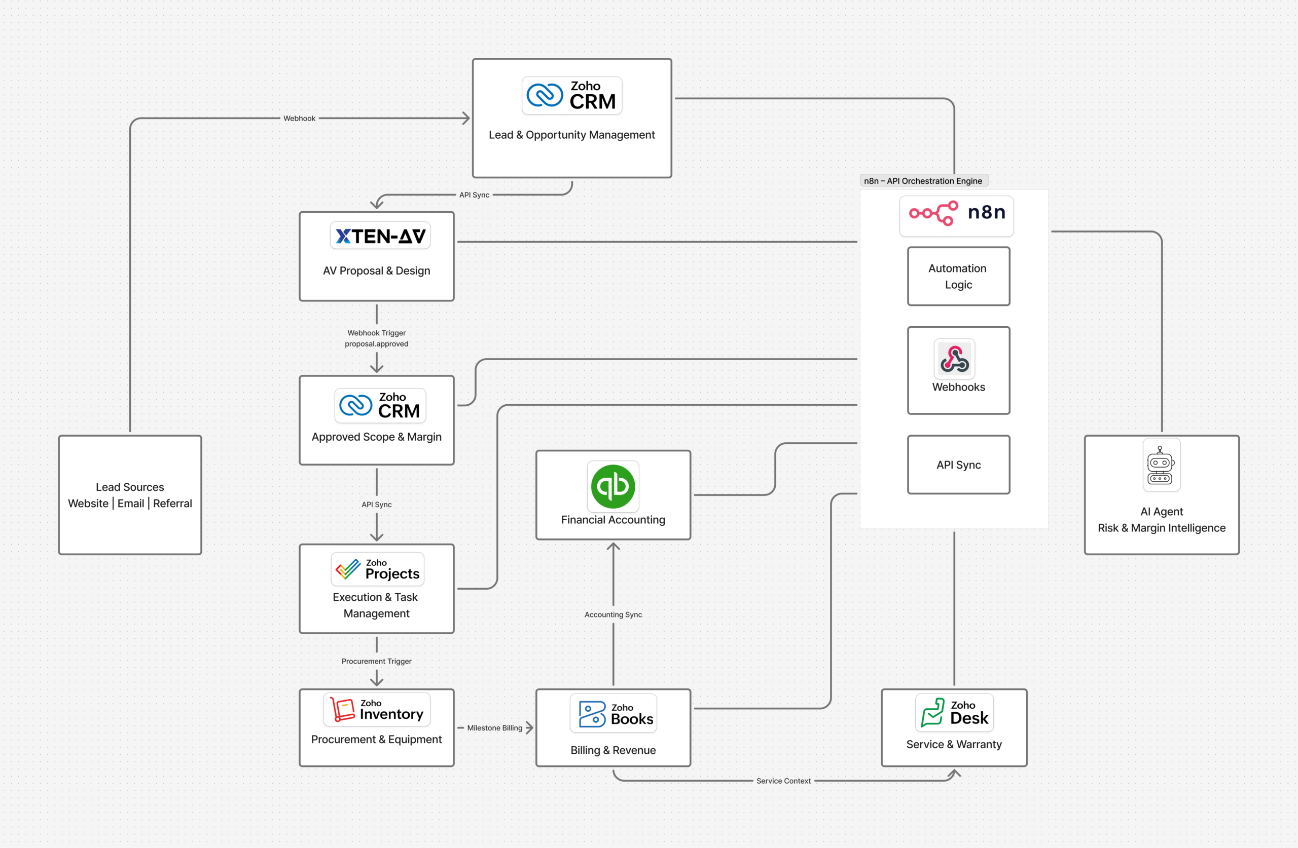 Platforms such as n8n extend this architecture. Acting as an automation spine, n8n manages conditional logic, error handling, and cross-platform communication between XTEN-AV, Zoho applications, QuickBooks, and other third-party systems.